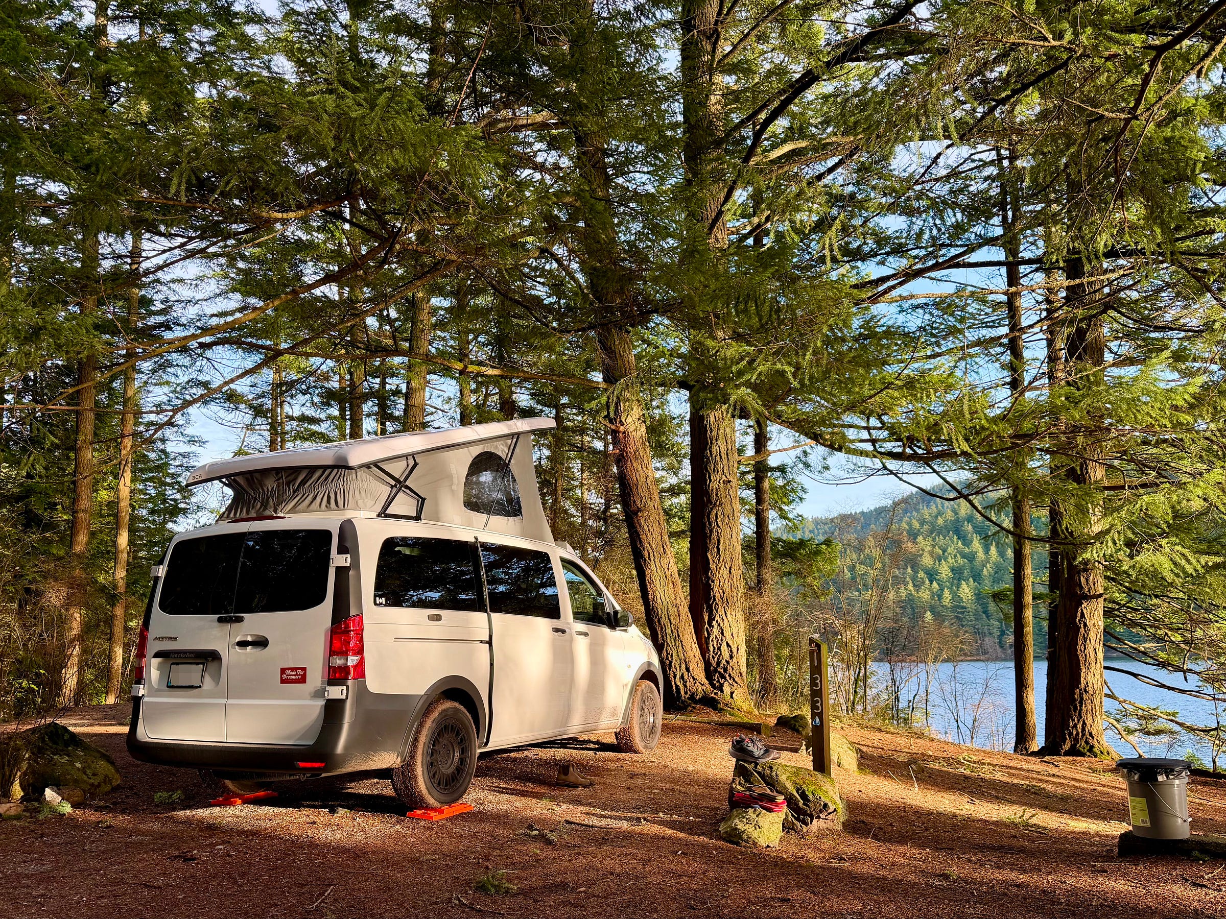Morning brought sun rays (actual sun) after three straight weeks of PNW rain. The campground was still empty. Not a single soul.