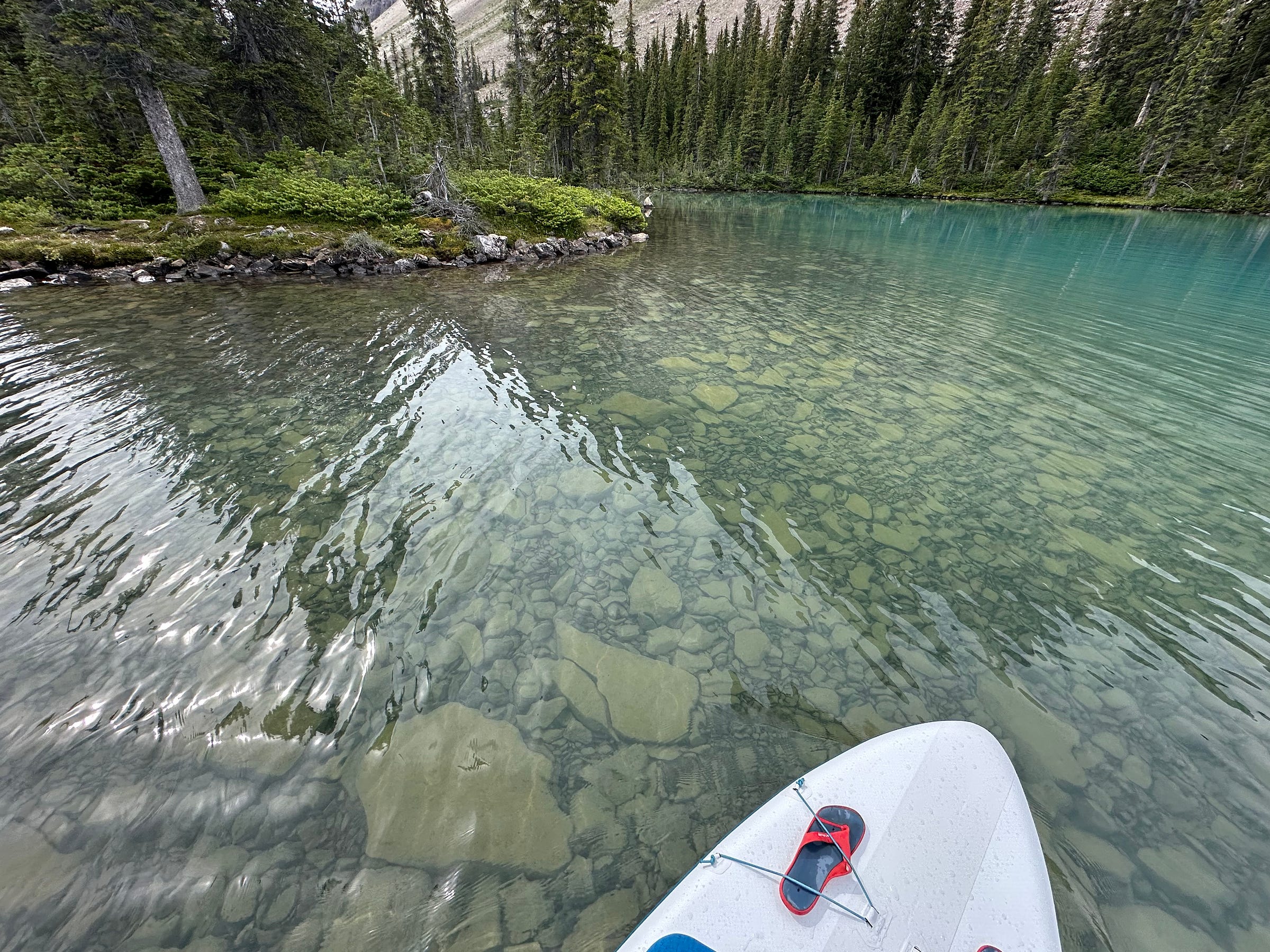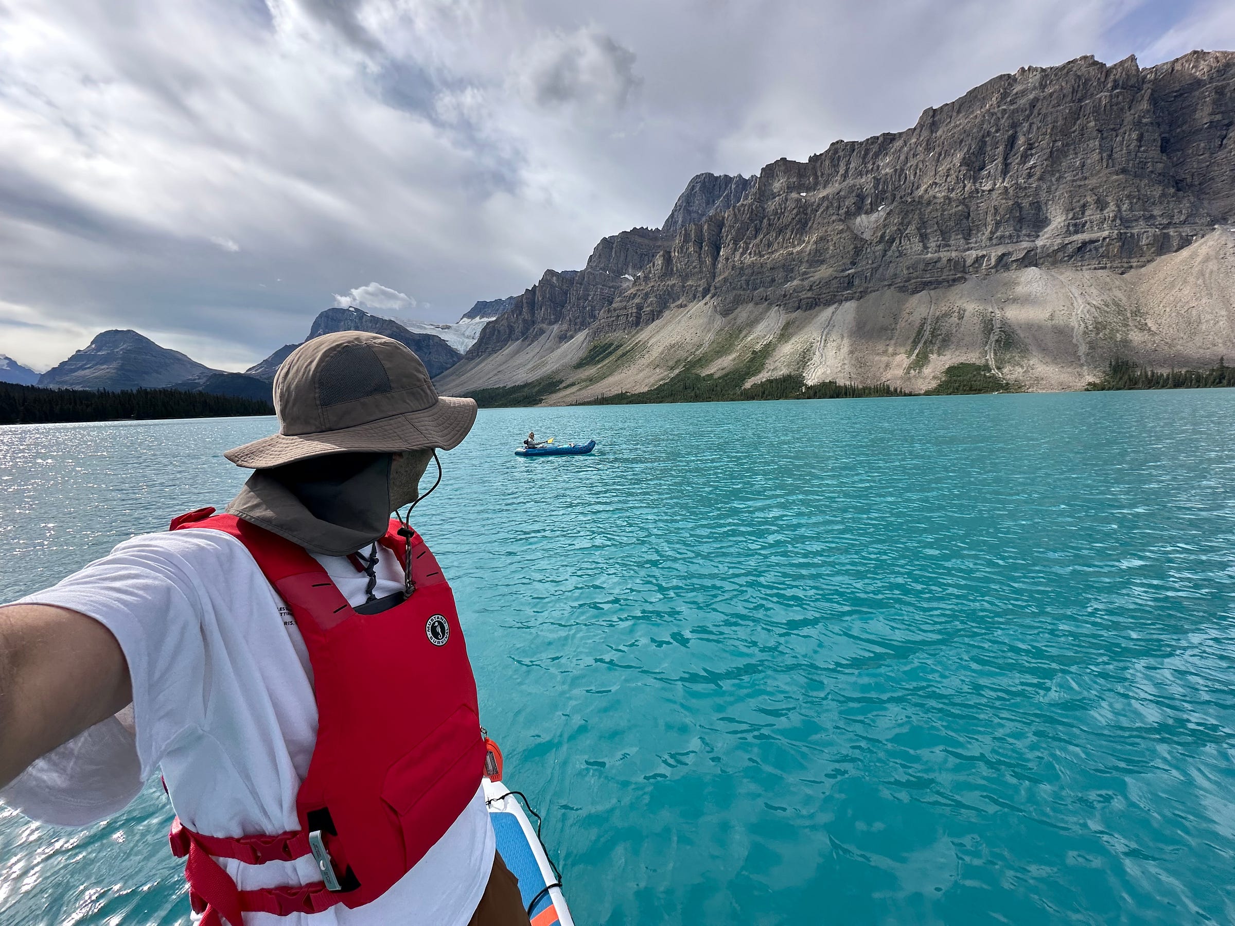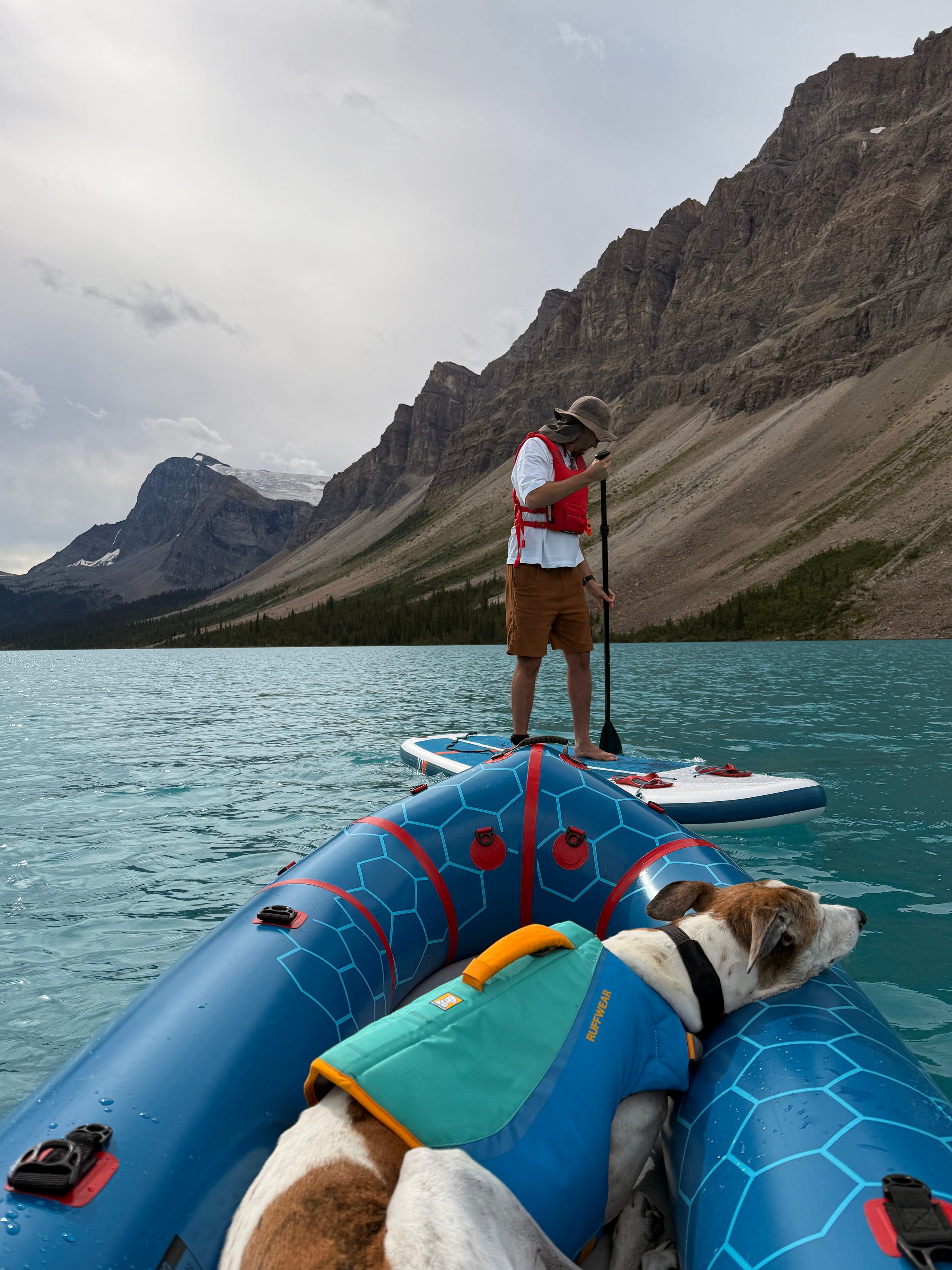 At first, Bow Lake was serene, then, out of nowhere, busloads of tourists appeared like a flash mob of pastel North Face jackets. But again, the water was empty. So we paddled. As we inflated the kayak and SUP, we became BeyoncĂŠ and JayâZ on a yacht - minus the yacht, plus 200 tourists with selfie sticks. Louie onboard, me paddling like a champ, AlizĂŠe laughing - while 200 tourists filmed us from shore like paparazzi (no joke, check out the video below!). They watched us like zoo animals. One guy might have live-streamed us to his aunt in Shanghai. Hahaha. The joke was on them: out on the lake, it was pure magic. Glacial turquoise, mountain mirrors, total silence.