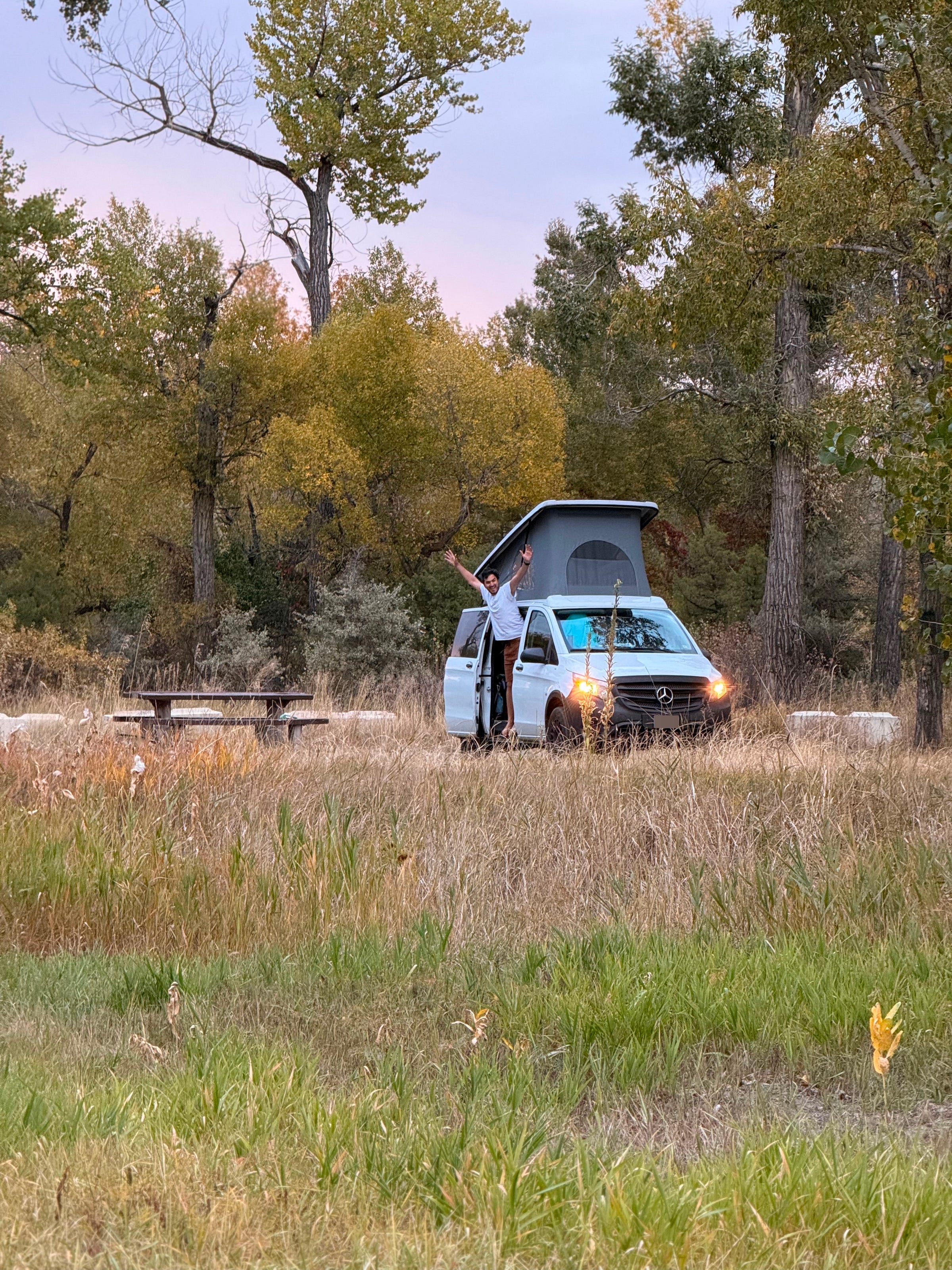 By late afternoon, we rolled into Columbus, Montana, where we found Itch-Kep-Pe Park. A donation-based campground so nice it felt like a setup. Grassy sites, river access, no one in sight. We showered behind the van in the fading light. Total freedom. Louie approved.